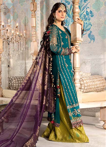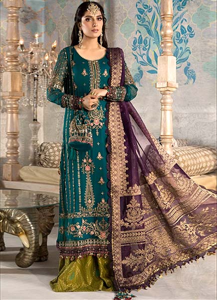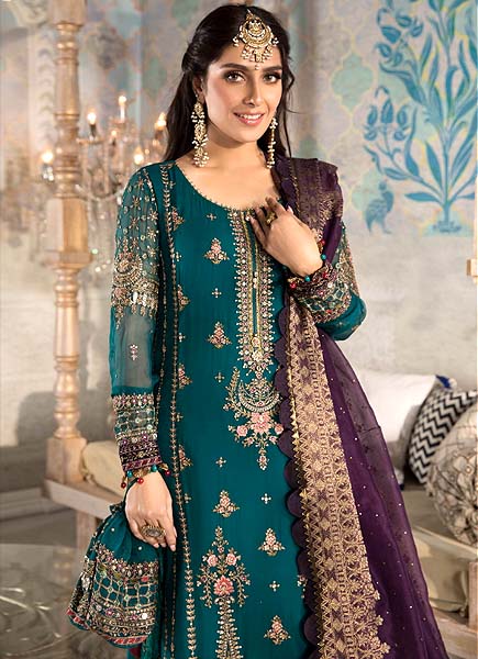 Immerse yourself in the splendor of the Maria B Embroidered Chiffon 3 Piece Unstitched Suit, a stunning display of luxury and intricate craftsmanship. This opulent ensemble features a chiffon centre panel adorned with fully heavy embroidered spangle work, radiating a dazzling array of intricate patterns. The side panels echo this splendor with their own heavy embroidered spangle detailing, complemented by two distinct types of heavy embroidered spangle daman borders that are further enhanced with fancy tulses. The chiffon plain back is beautifully contrasted with a heavy embroidered spangle work back daman border, adding depth and continuity to the design. The sleeves are equally luxurious, featuring full heavy embroidered spangle work along with embroidered spangle work sleeves lace, finished with fancy tulses for an extra touch of elegance. Completing the look is an organza dupatta with elaborate heavy embroidered lace on all four sides, and fully heavy embroidered pallu attachments that evoke the feel of jacquard, adorned with fancy tulses for a regal finish. The ensemble is paired with a jamavar trouser, ensuring a sophisticated and cohesive appearance for any grand occasion.