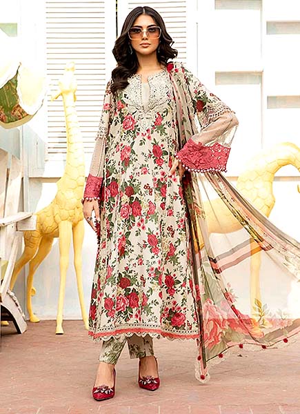 Experience the epitome of elegance with the Maria B Embroidered Lawn 3Pcs Unstitched collection. Crafted with meticulous attention to detail, this ensemble features a printed lawn back that combines comfort with sophistication. The printed cambric trouser complements the look with its stylish print and comfortable fabric while the printed chiffon dupatta adds a light and airy touch with its intricate designs. The highlight of this collection lies in its heavy spengle work neckline, adorned with intricate detailing that exudes luxury. Further enhancing its allure are the front embroidered spengle work and sleeves delicately adorned with embroidery and spengle work showcasing expert craftsmanship. Perfect for both formal occasions and festive celebrations, this collection seamlessly blends traditional charm with contemporary elegance, ensuring you make a memorable statement with every wear.