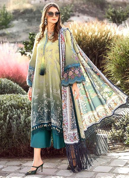 Elevate your summer wardrobe with the exquisite Maria B Lawn Collection. Crafted with meticulous attention to detail, this 3 piece unstitched suit exudes elegance and charm. The ensemble features a printed lawn back and sleeves, complemented by a luxurious printed chiffon dupatta that adds a touch of sophistication. The plain dyed soft cotton trouser ensures comfort without compromising on style. Adorned with embroidered cuff and bazo patch, this ensemble strikes the perfect balance between tradition and contemporary fashion. With printed lawn front, back and sleeves along with an embroidered neck patch on tissue, this ensemble is a testament to impeccable craftsmanship and timeless beauty. Experience the epitome of grace and allure with the Maria B Lawn Collection.