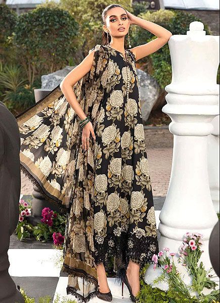 Indulge in the epitome of elegance with the Maria B Lawn Collection 3Pcs Unstitched Suit. A masterpiece of craftsmanship, this ensemble boasts a stunning printed lawn front adorned with a lavish embroidered spangle work daman border exuding opulence and grace. The ensemble is further accentuated with delicate embroidered shoulder lace adding a touch of sophistication to your look. Complementing the front is a serene printed lawn back, accompanied by charming printed lawn sleeves for a harmonious balance of style. Complete the ensemble with a mesmerizing printed chiffon dupatta and a chic printed cambric trouser, ensuring a captivating presence at every occasion. Elevate your style quotient with the Maria B Lawn Collection where luxury meets tradition in perfect harmony.