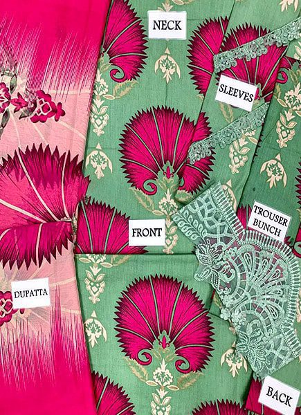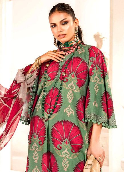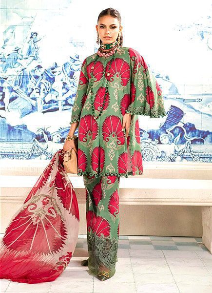 Introducing the Maria B Lawn Collection’s 3 Piece Unstitched Suit which is a perfect blend of tradition and modern elegance. This ensemble features a beautifully printed lawn back exuding sophistication and style. The printed chiffon dupatta adds a lightweight and airy touch ideal for any season. Paired with a printed cambric trouser, this suit ensures all day comfort without compromising on chicness. The embroidered sleeves bunches bring a touch of intricate beauty to the design while the embroidered spengle work neckline adds a stunning detailed finish. Perfect for both casual and formal occasions, this suit effortlessly combines traditional charm with contemporary flair ensuring you look stylish and refined.
