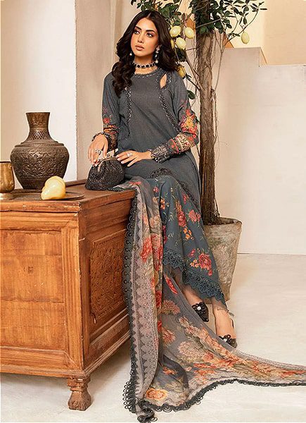 Introducing the Maria B Lawn Collection 3 Piece Unstitched ensemble where elegance meets craftsmanship in every detail. This exquisite set includes a printed lawn front adorned with intricate, fully heavy embroidered spangle work on the daman border, complemented by an embroidered spangle work neckline that adds a touch of sophistication. The ensemble is completed with a printed lawn back for balanced aesthetics and printed lawn sleeves featuring embroidered spangle work borders, offering a seamless blend of tradition and modernity. A chiffon printed dupatta enhances the ensemble with its lightweight elegance while the dyed cambric trouser ensures comfort and versatility. Perfect for those who appreciate quality and style, the Maria B Lawn Collection promises a timeless addition to your wardrobe, ideal for both casual outings and festive occasions. Discover the allure of meticulous craftsmanship and impeccable design with this exquisite 3 piece unstitched ensemble.