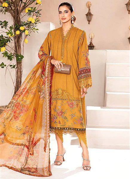 Introducing the Maria B Lawn Collection 3 Piece Unstitched ensemble where elegance meets craftsmanship in every detail. This exquisite set includes a printed lawn front adorned with intricate, fully heavy embroidered spangle work on the daman border, complemented by an embroidered spangle work neckline that adds a touch of sophistication. The ensemble is completed with a printed lawn back for balanced aesthetics and printed lawn sleeves featuring embroidered spangle work borders, offering a seamless blend of tradition and modernity. A chiffon printed dupatta enhances the ensemble with its lightweight elegance while the dyed cambric trouser ensures comfort and versatility. Perfect for those who appreciate quality and style, the Maria B Lawn Collection promises a timeless addition to your wardrobe, ideal for both casual outings and festive occasions. Discover the allure of meticulous craftsmanship and impeccable design with this exquisite 3 piece unstitched ensemble.