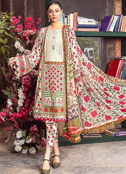 Introducing the Maria B Lawn Embroidery 3Pcs Unstitched Collection where sophistication meets tradition. Elevate your wardrobe with this exquisite ensemble meticulously crafted to enhance your style. The printed lawn front features a stunning heavy embroidered scifflie neckline exuding timeless elegance and charm. Complemented by a heavy embroidered daman border, this ensemble exudes sophistication from every angle. Crafted for comfort and style, the printed lawn back and sleeves offer a seamless blend of grace and allure. Complete your look with the printed chiffon dupatta, draping you in sheer luxury and the printed cambric trouser for a perfect finish. Whether it’s a casual outing or a special occasion, the Maria B Lawn Embroidery 3Pcs Unstitched Collection promises to make you shine with its unmatched charm and impeccable craftsmanship. Step into elegance and let your style speak volumes.