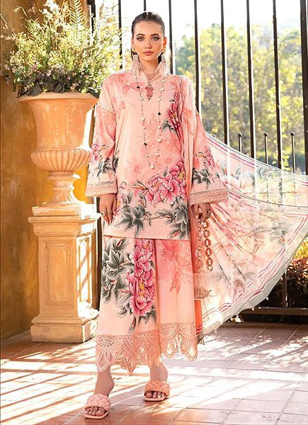 Discover the epitome of elegance with the Maria B Lawn Embroidery 3Pcs Unstitched ensemble meticulously designed to captivate hearts. Embellished with exquisite craftsmanship, the Printed Lawn Front features a lavish heavy embroidered front neck bunch exuding sophistication and charm. The Printed Lawn Back adds a subtle grace while the Printed Lawn Sleeves adorned with embroidered bunches offer a touch of refined luxury. The ensemble is further enhanced by the Daman heavy embroidery and two side chalk embroidered details elevating its allure to new heights. Complete the look with the ethereal chiffon printed dupatta, draping delicately and the Printed Cambric Trouser, ensuring both style and comfort. Embrace timeless elegance with Maria B Lawn Embroidery 3Pcs Unstitched – a blend of tradition and contemporary sophistication.