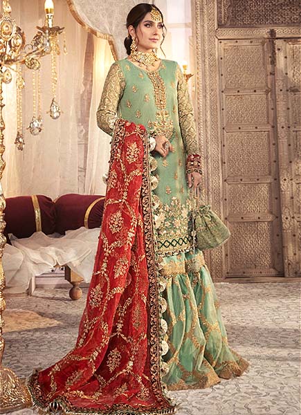 Embrace unparalleled sophistication with the Maria B Embroidered Mysoori Zari Net 3 Piece Unstitched Suit, a marvel of intricate design and luxurious craftsmanship. The ensemble features a Mysore net front that is lavishly adorned with fully heavy embroidered spangle work, creating a mesmerizing shimmer. The front is complemented by a heavy embroidered spangle daman border, embellished with fancy tulses, and an exquisitely detailed neckline that combines embroidered spangle work with heavy adha embellishment for a striking focal point. The plain Mysore back provides a refined contrast to the ornate front, ensuring a balanced and elegant appearance. The Mysore sleeves continue the theme with full heavy embroidered spangle work and detailed sleeve borders, offering continuity in design. The organza gharara, with its jacquard like heavy embroidery, provides a voluminous and regal silhouette, featuring full length and an impressive 104 inch width. The organza dupatta enhances the ensemble with its fully heavy embroidered spangle work, framed by four sided embroidered spangle borders and adorned with hanging tulses, adding a majestic finishing touch. Completing the outfit is a dyed satan trouser, ensuring a seamless and sophisticated finish for any high profile event or celebration.